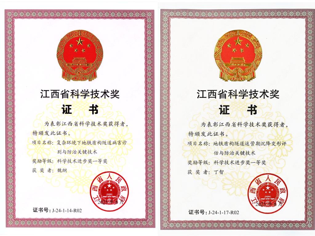 我校作为主要完成单位参与的两项科研成果,依托“山区土木工程安全与韧性全国重点实验室”“浙江省城市盾构隧道安全建造与智能养护重点实验室”等重大科研平台,双双荣获江西省科学技术进步奖一等奖!